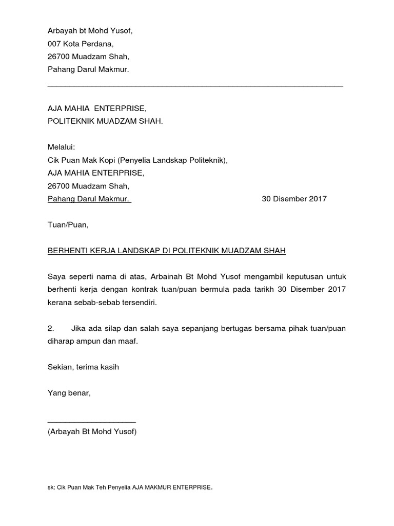 Format surat kiriman rasmi berhenti kerja. The collection that consisting of. 2 from Contoh surat penarikan diri program gap year.